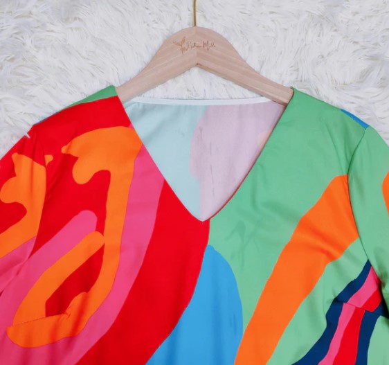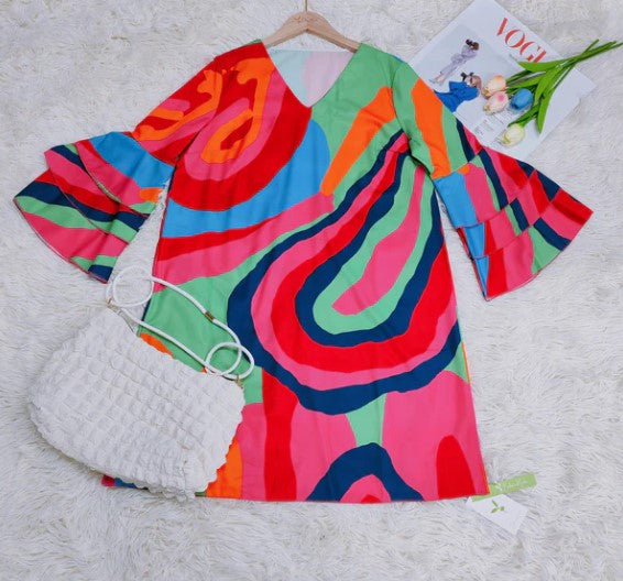 Hazel - flerfarvet minikjole med buede striber og klokkeærmer