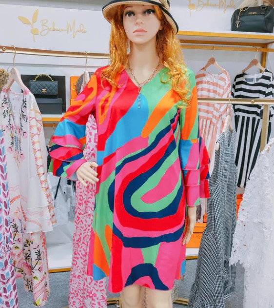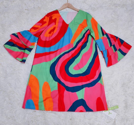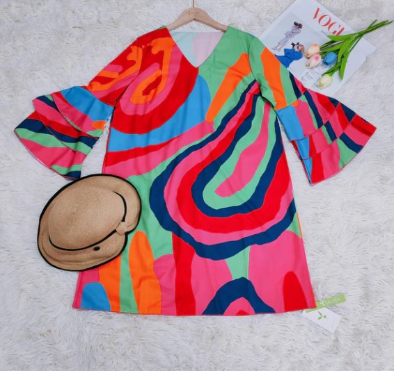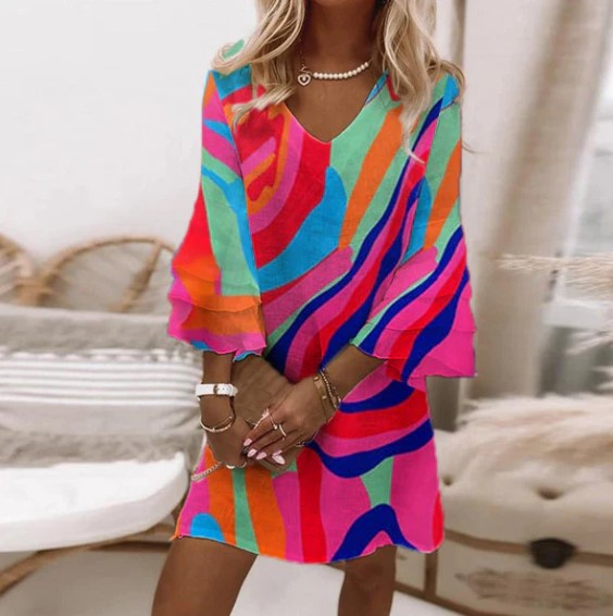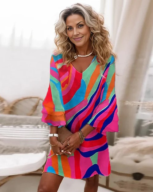 "Hazel, Flerfarvet Minikjole med Buede Striber og Klokkeærmer: En iøjnefaldende minikjole med et flerfarvet stribemønster og elegante ærmer, perfekt til en trendy og livlig stil.""