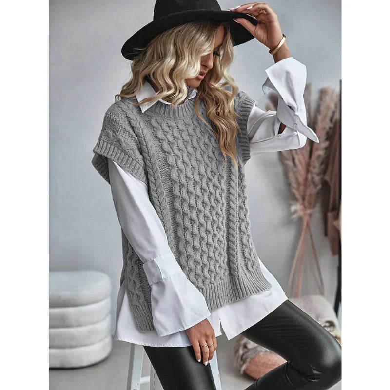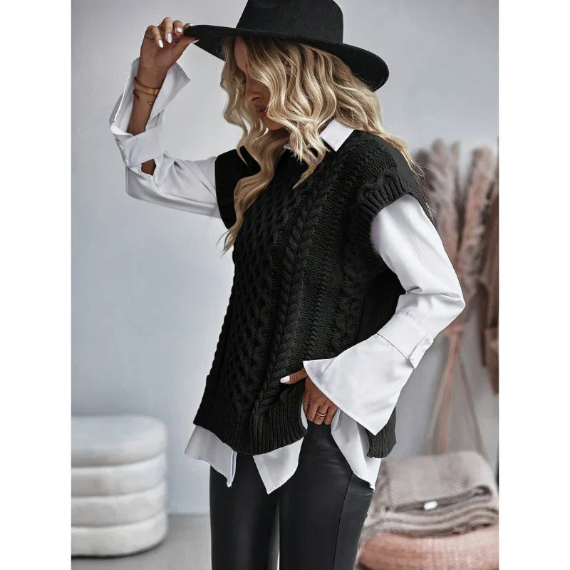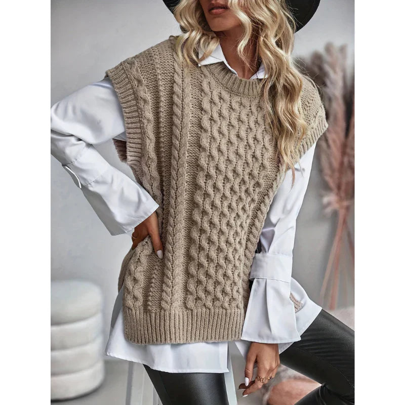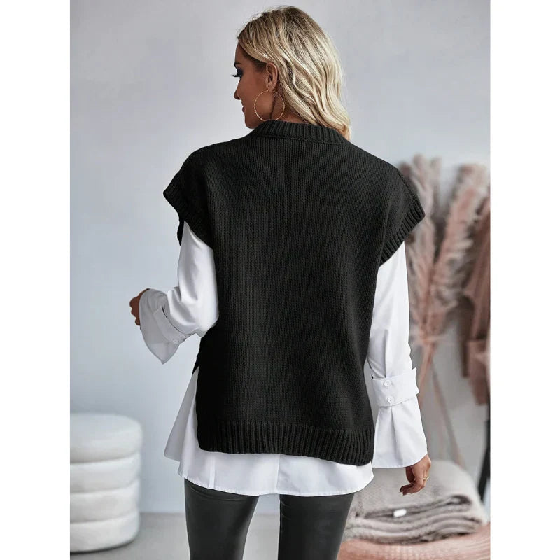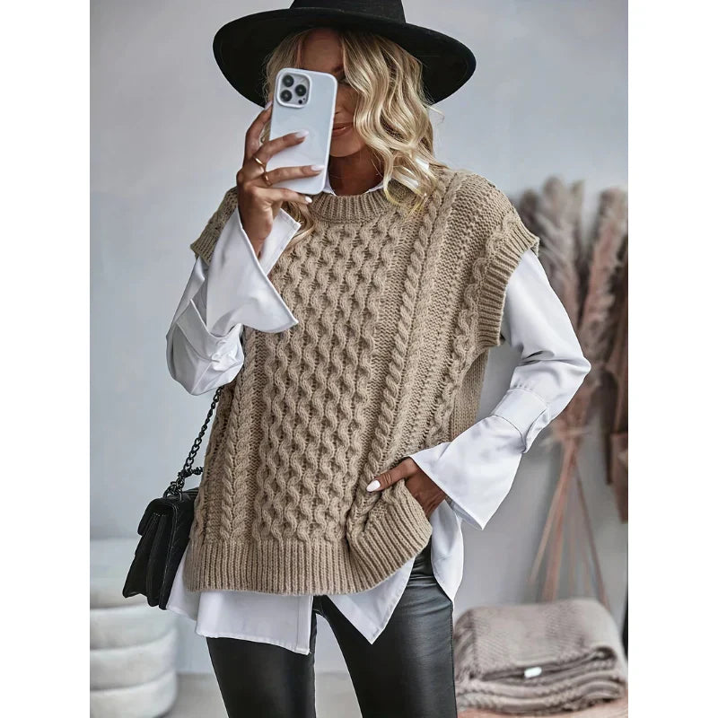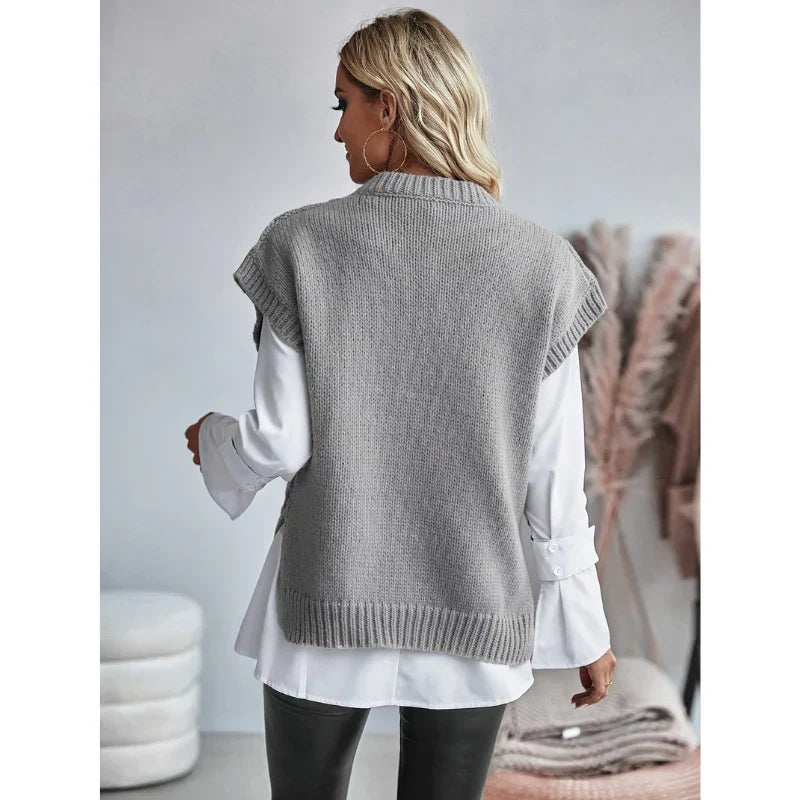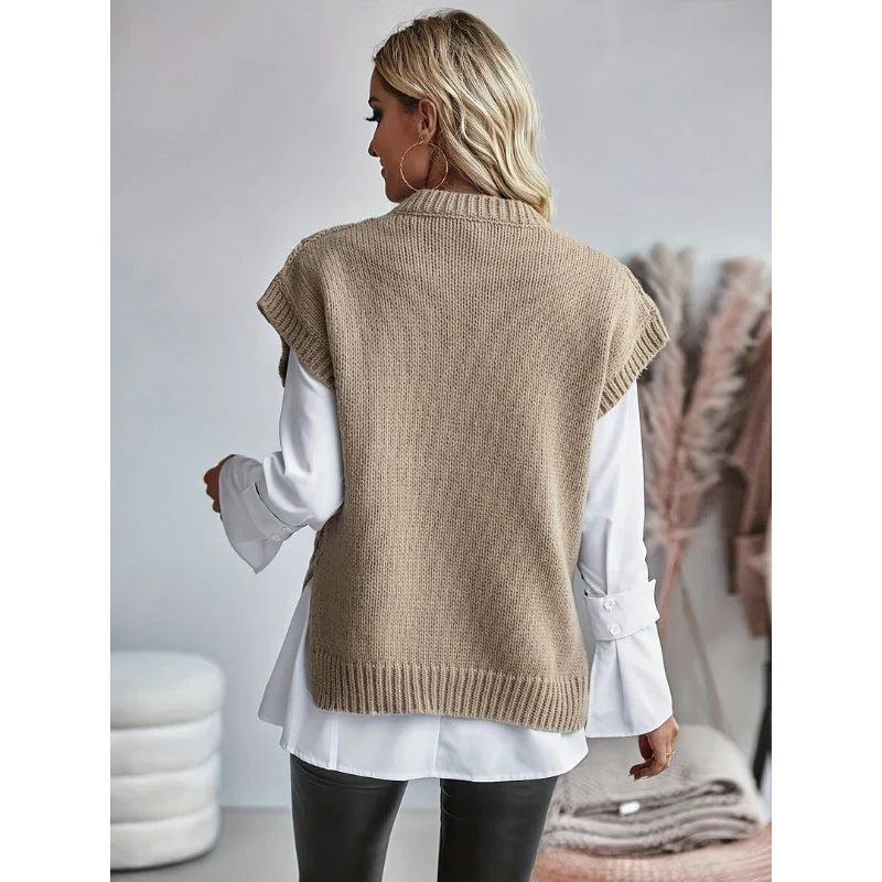 Ærmeløs strikket vest til kvinder i et tidløst design tilbyder klassisk stil med hverdagskomfort . Den er lavet af blødt strikstof og er perfekt til at have på lag eller alene. Med sit rene, elegante look og behagelige pasform er denne alsidige vest ideel til arbejde, afslappede outfits eller sæsonbestemt lag-på-lag-på-lag-tøj.