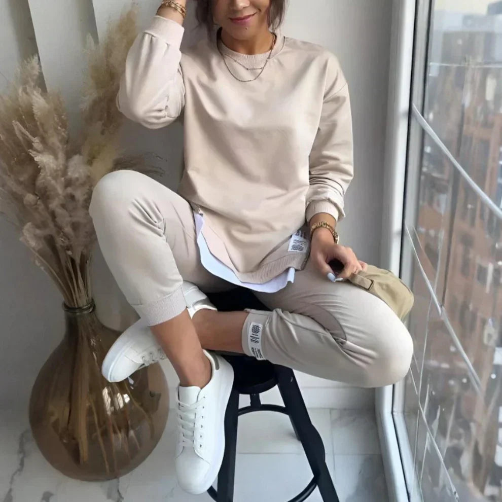2-delt buksesæt og sweatshirt i patchwork til kvinder