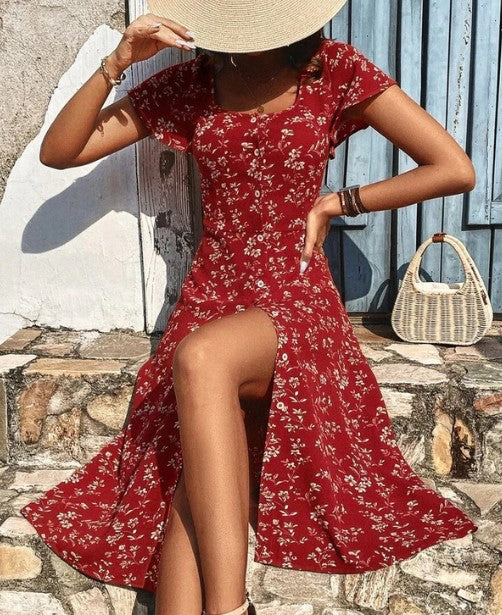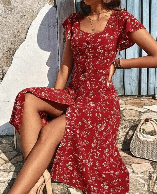 "Zoe, Elegant Midikjole med Rødt Print og Firkantet Halsudskæring: En sofistikeret midikjole med et smukt rødt print og en firkantet halsudskæring, perfekt til stilfulde og elegante anledninger."