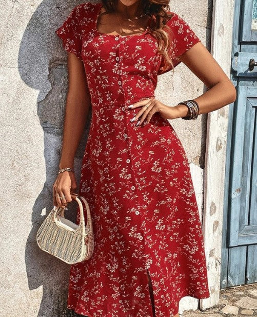 Zoe - elegant midikjole med rødt print med firkantet halsudskæring